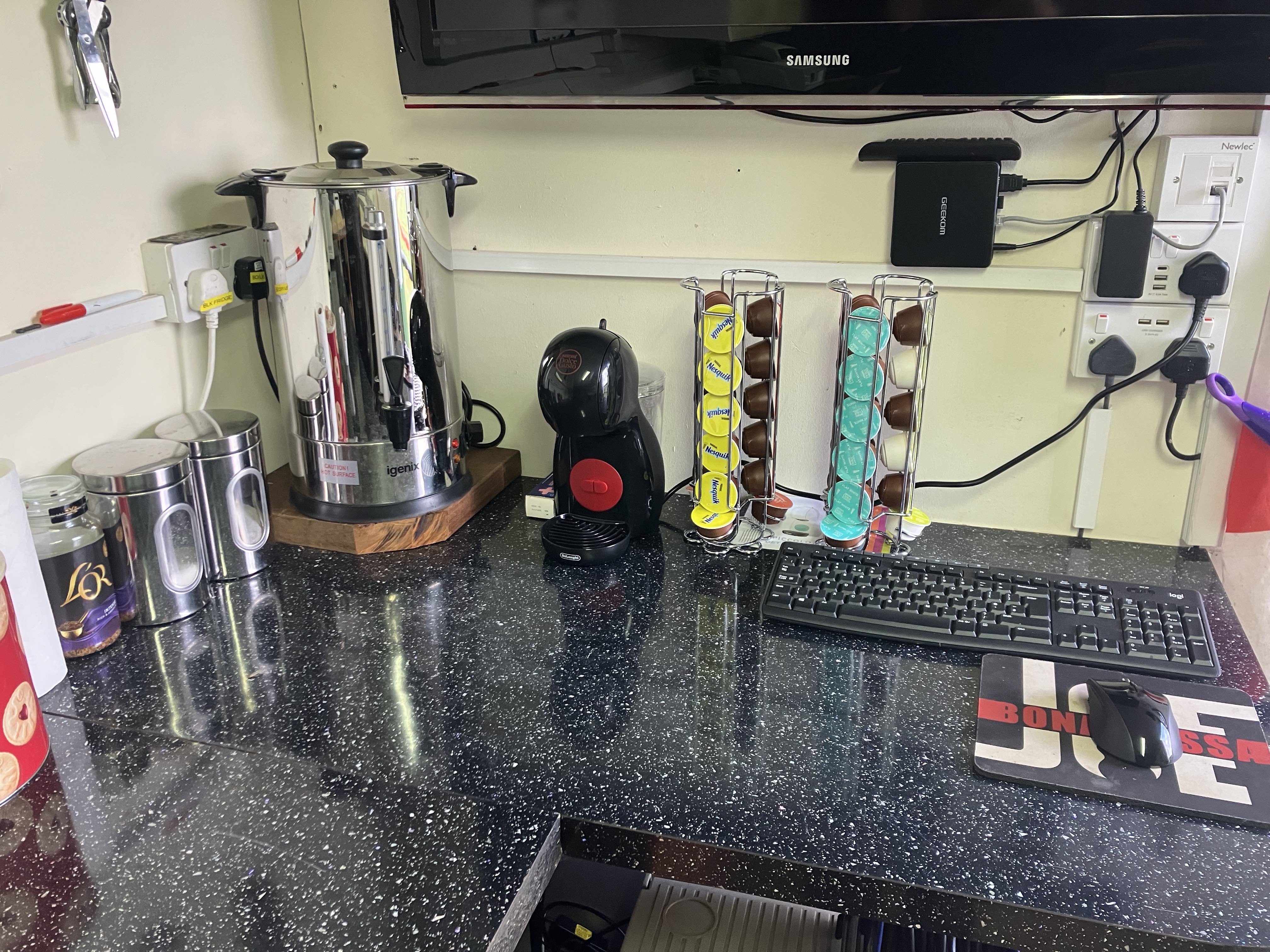 Above: The in house brew making facilities. With the normal tea and coffee. Plus a coffee machine with 6 different flavours of coffee to choose from