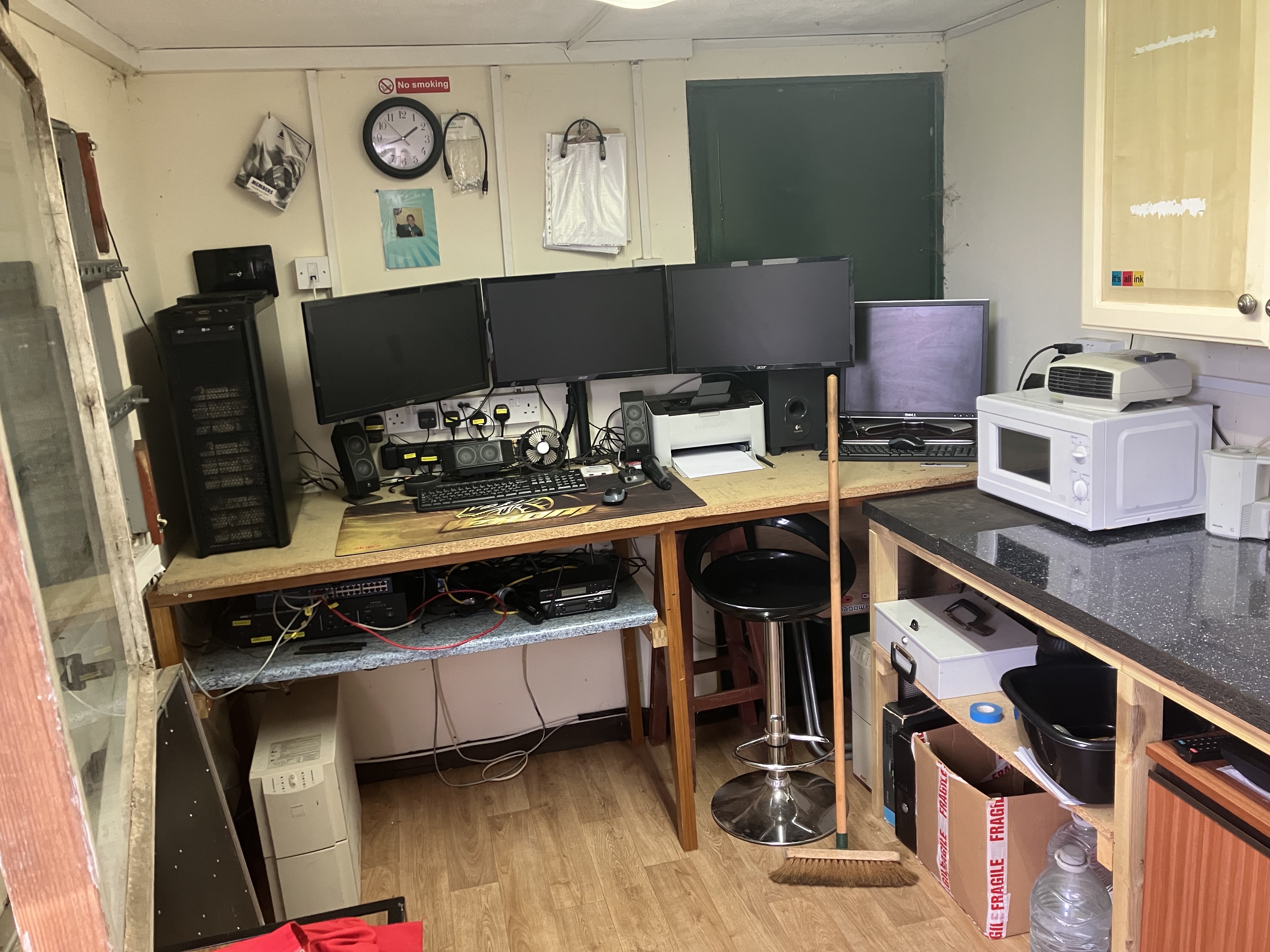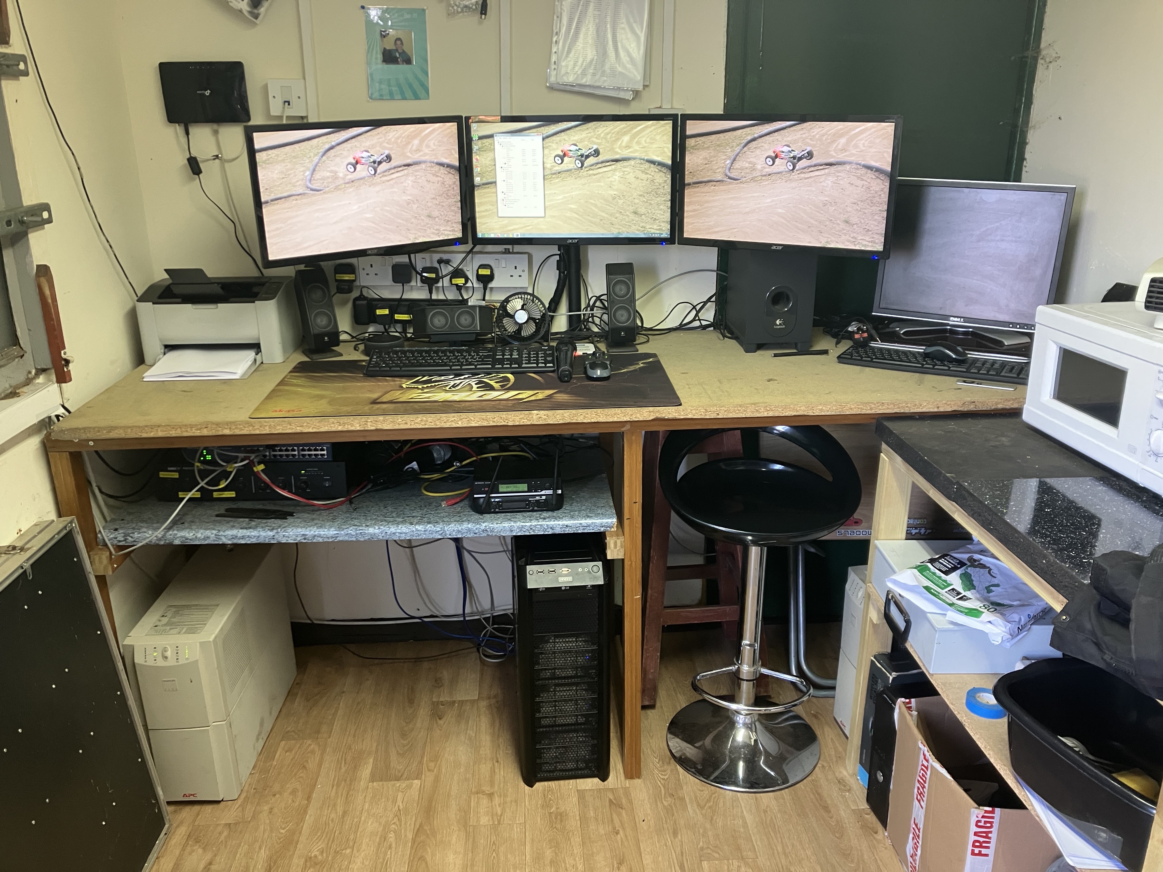 Above: Main race computer that been replaced. New monitors and a better wireless mouse and keyboard. Router for the broadband can be seen on the wall on the left of the photo