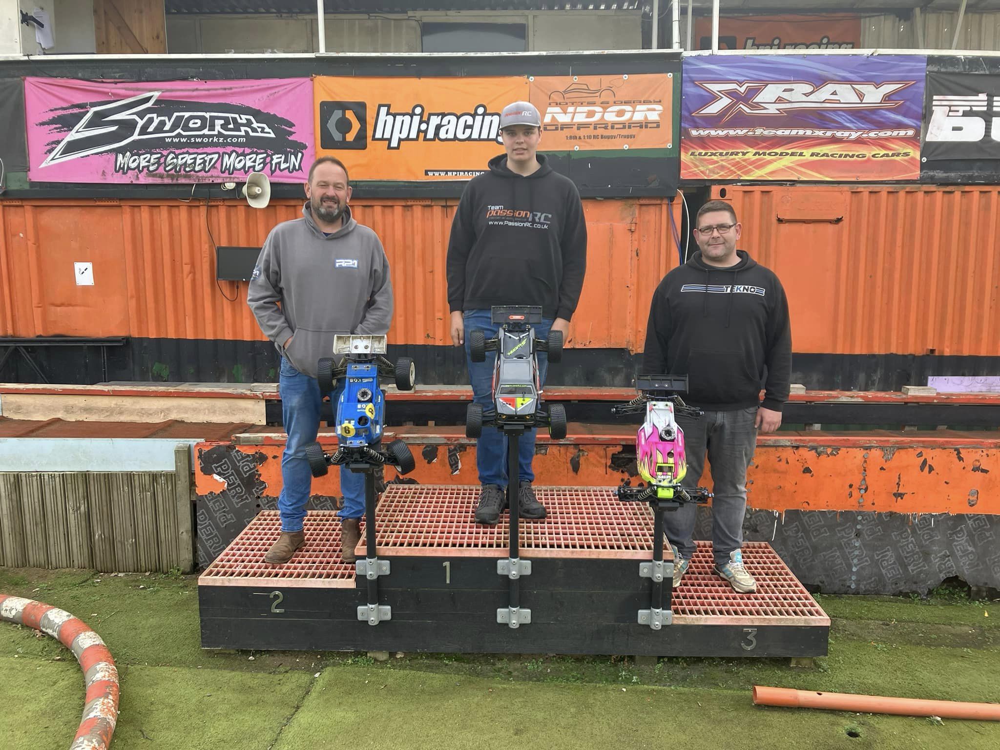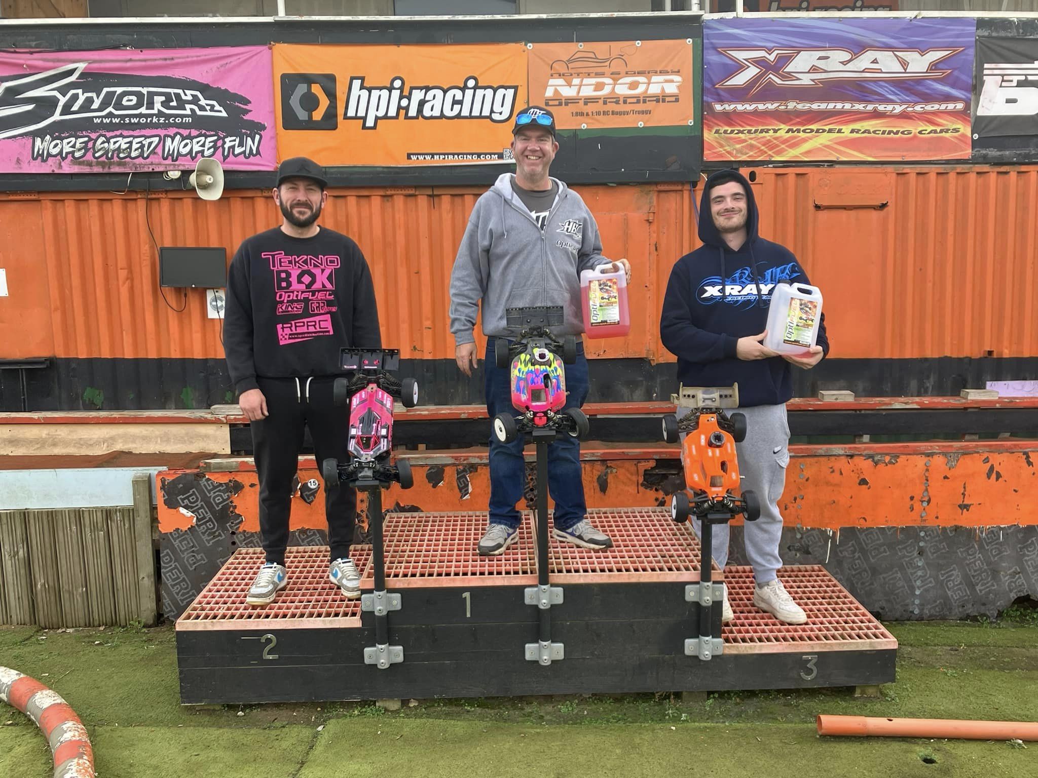 With this greeting us on saturday morning practice was obviously cancelled. The club committee and many local drivers did their upmost throughout the whole day to clear the water off the track. It took over 10 hours and a burnt out pump to get it all sorted. Massive shout out to the team who worked their arses off to get this sorted for us. The meeting ran smoothly on the Sunday until we had a major downpour around 2pm were there was sadly puddles starting to form on the track in places. Many drivers at that point at the end of qualifying decided to call it a day and not race anymore. However there were enough brave/crazy souls that wanted to continue racing with my self being one of them. So we ran the two finals and we saw Daniel Thorne take the win with his Truggy, Chris Carlise in second place and Jason Hocking take third place.