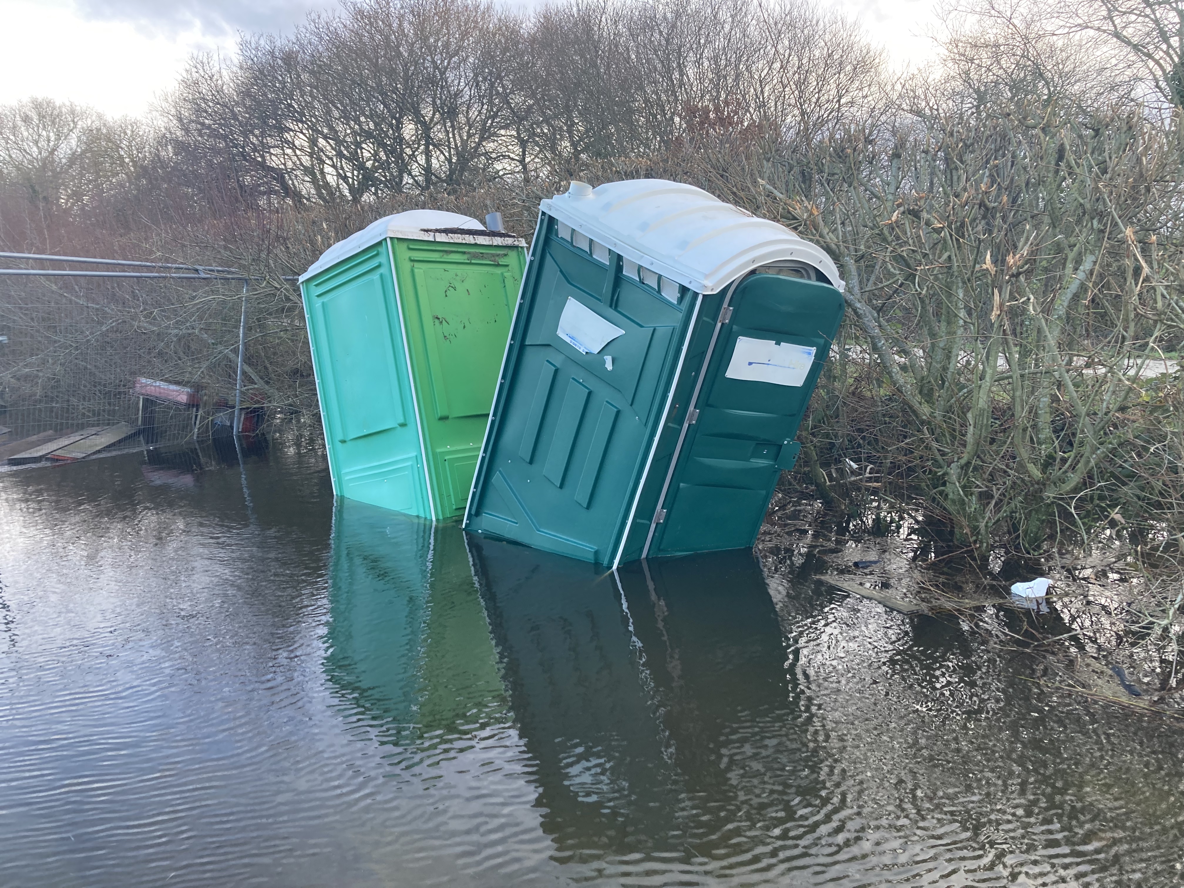 As you can see in this photo I am walking about with my phone doing a live stream to Facebook. You can check this out on the AWS Facebook page. There were so much water on the track and around the area the porta loos were actually floating!